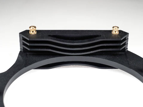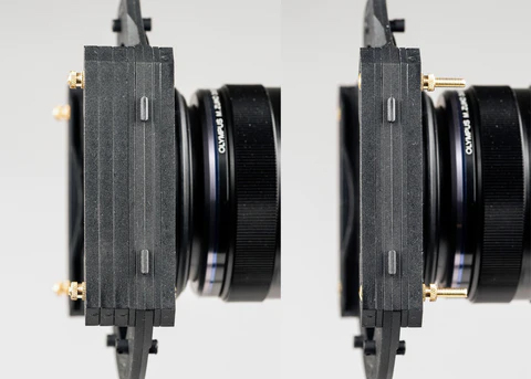 Вам також можуть бути цікаві три штифти, два знизу і один зверху, які трохи ковзають вперед і назад. Ці штифти мають утримувати перехідне кільце на місці. Зсуньте їх вперед і вставте перехідне кільце в проріз у задній частині тримача, а потім засуньте їх назад, щоб вони залишалися на місці. Це також дає змогу вільніше переміщати довші градуйовані фільтри вгору і вниз.
